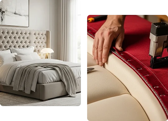 We handle everything from small touch-ups to complete reupholstery. Our team works with precision so your headboard not only looks new, but feels better than the day you bought it. Fabric Replacement service allows you to choose from high-end fabrics like velvet or suede. You can also select leather and synthetic fabrics. You get over 200+ color options. We replace old foam with dense hypoallergenic foam for extra comfort. Most clients report a 30% improvement in sleep posture after proper padding. If your headboard feels wobbly, we tighten the joints. We also remove marks, scratches, and burns without needing full replacement.